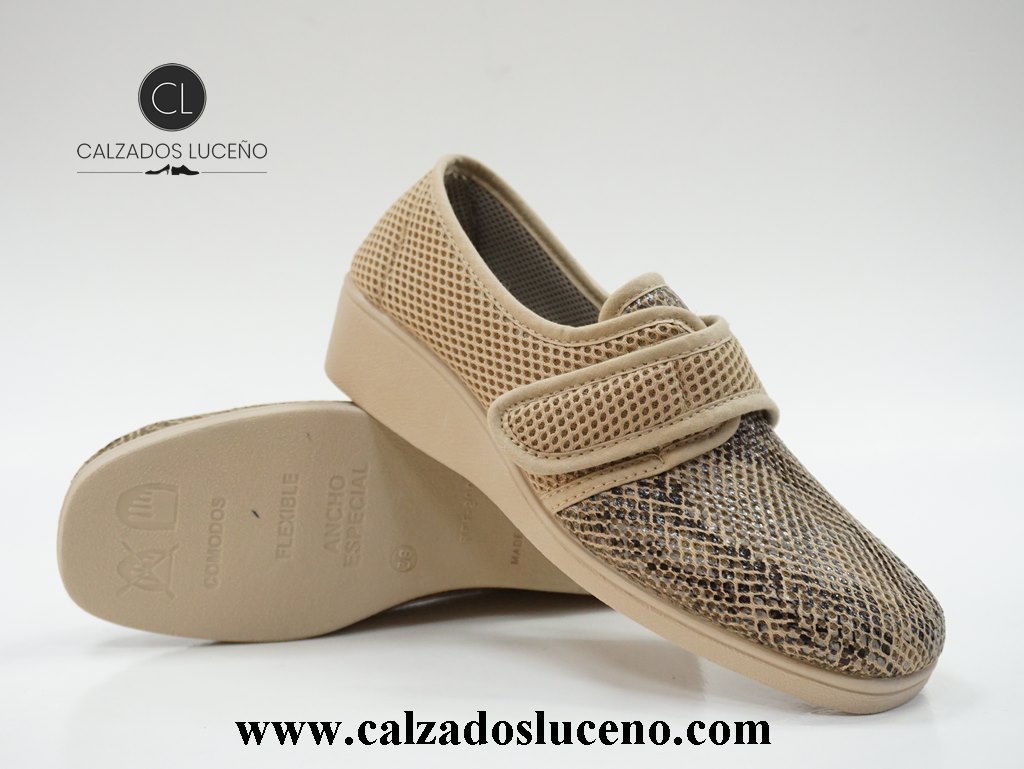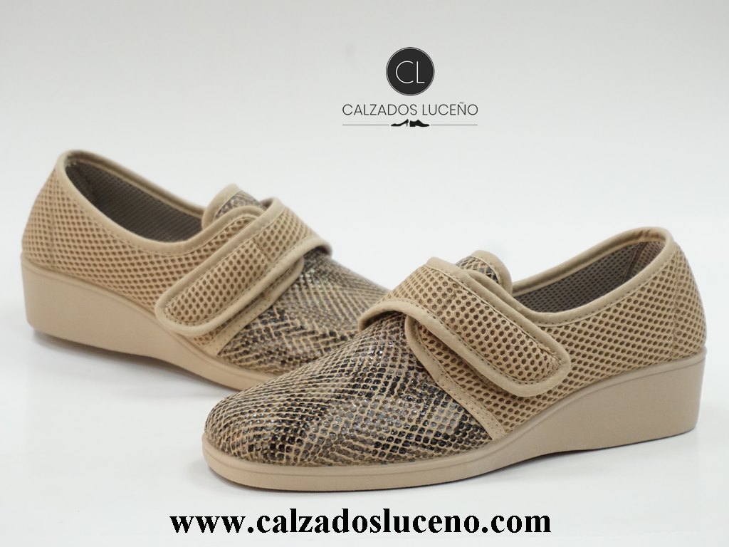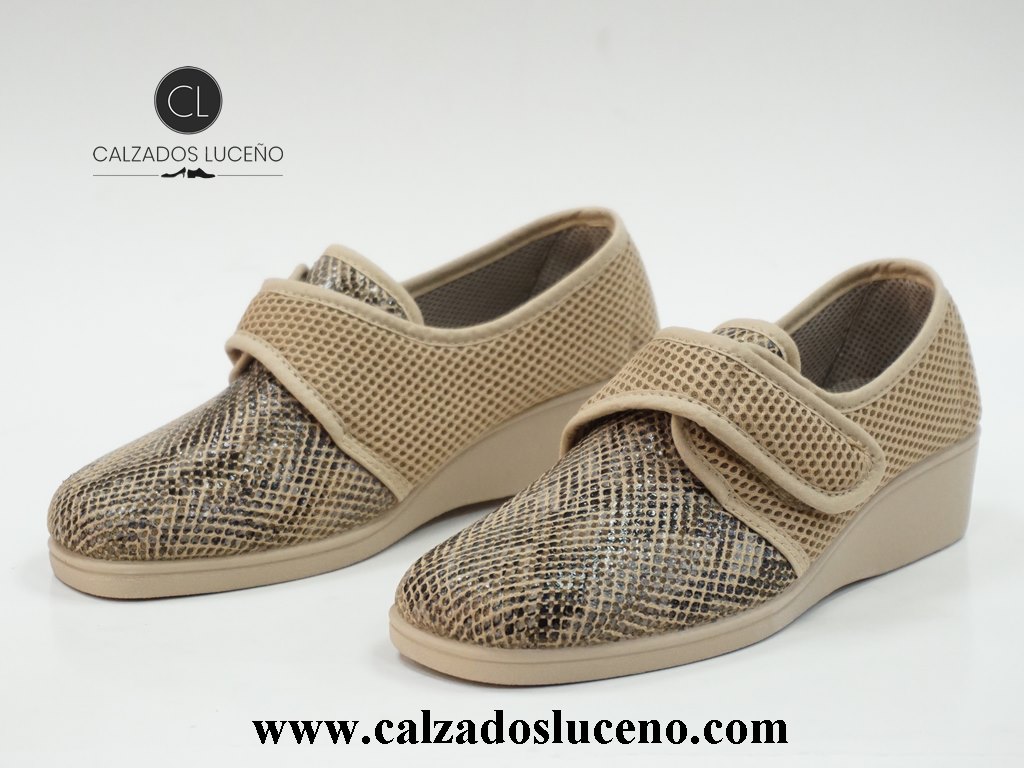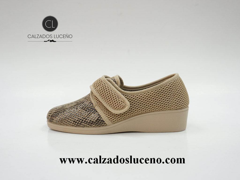 A.Campello Zapatilla Cuña Mujer Velcro Ergonómica Modelo 1588 Rejilla Beige Con Suela Antideslizante y Muy Ligeras.