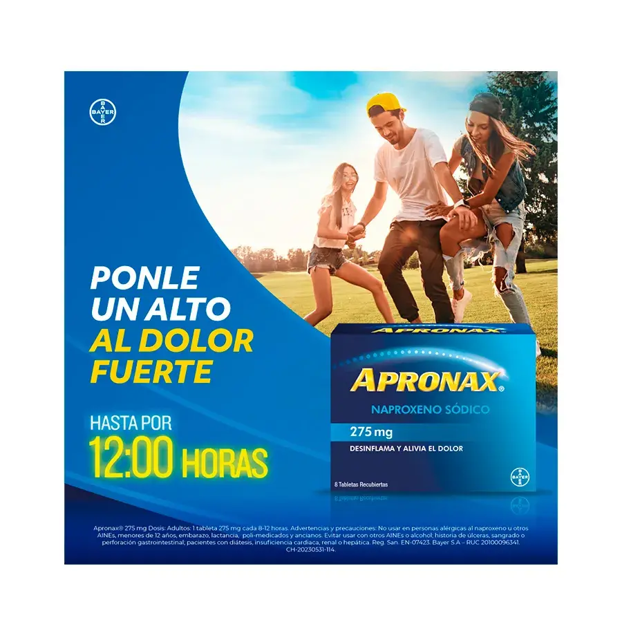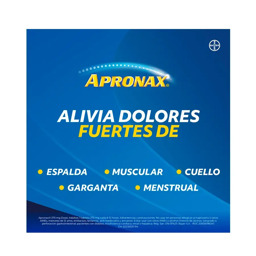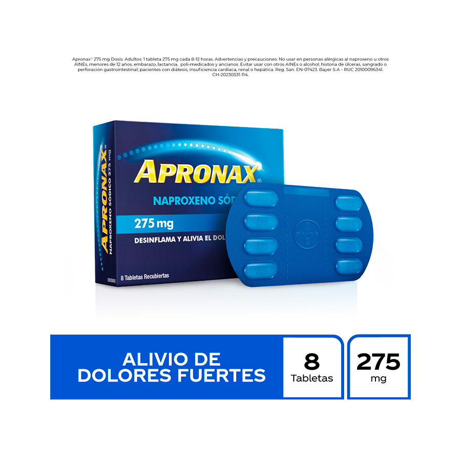 APRONAX® 275 mg pertenece al grupo de analgésicos, antipiréticos y antiinflamatorios. El principio activo es el naproxeno sódico. Desinflama y alivia el dolor de cabeza, dolor de muelas y dientes, dolores musculares, lumbago, dolores reumáticos, dolores menstruales, dolor y fiebre en gripes y resfriados, fiebre y dolor después de vacunas.