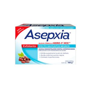 Los jabones Asepxia. Esta especialmente diseñado y recomendado para piel mixta con imperfecciones, su nueva fórmula Hidro-Force presenta una mezcla única de ácido salicílico y glicólico combinado con extractos de ingredientes naturales que entre sus principales acciones destacan el reducir el tamaño de los poros, eliminar toxinas, reducir puntos negros además disminuye la grasa y brillo de la cara.